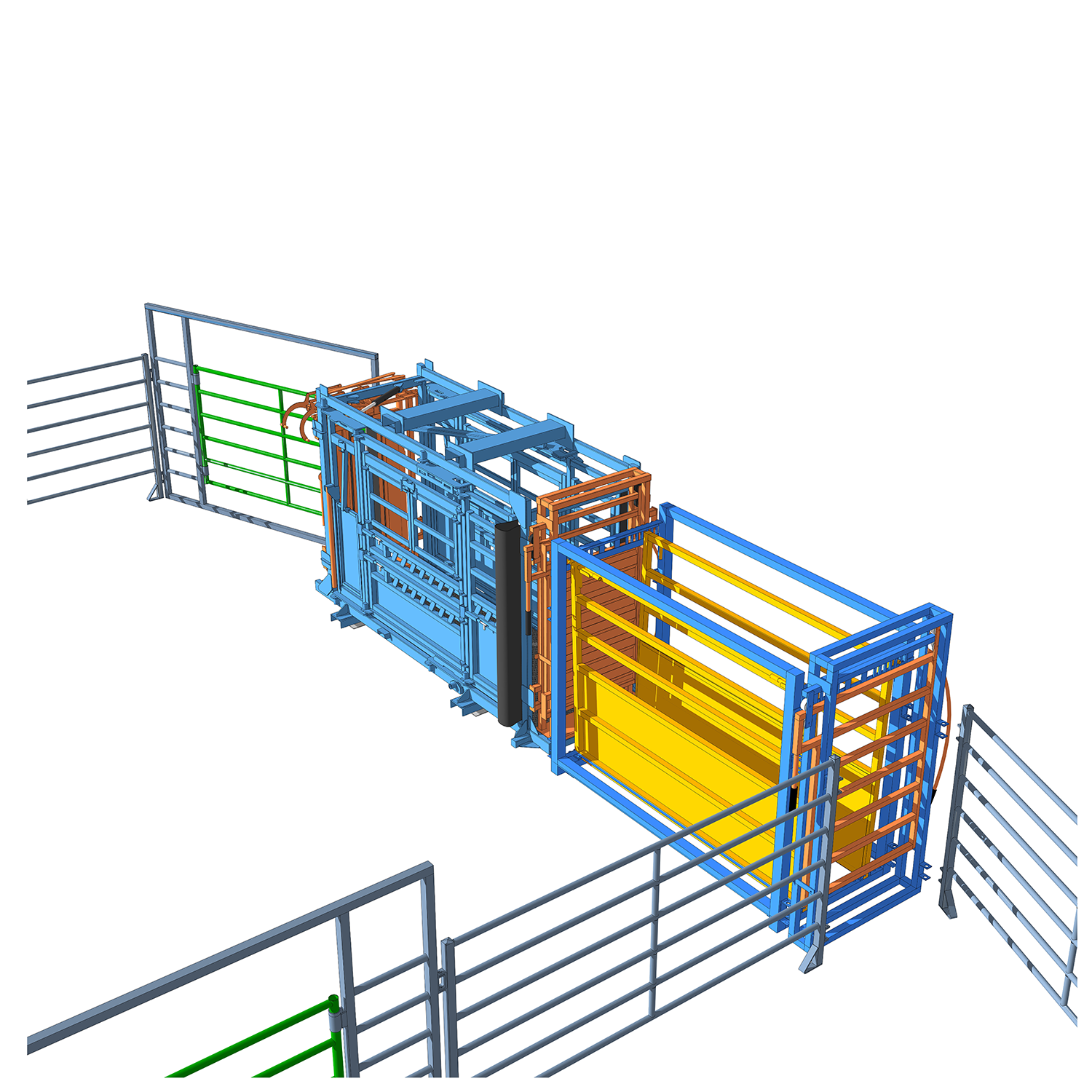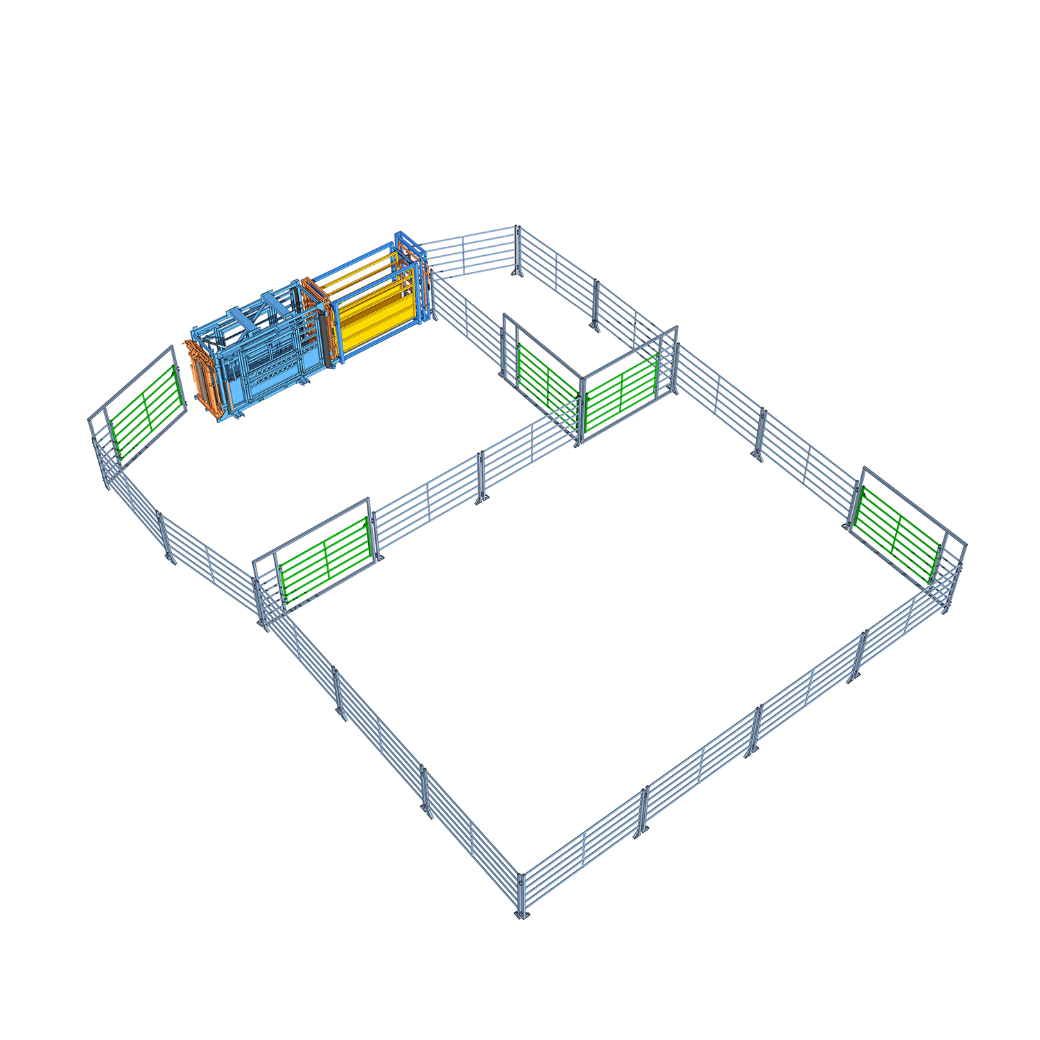 Компактная конфигурация для ежедневных операций: вакцинация, чипирование, взвешивание, отбор и сортировка. Входные ворота можно ставить в любой точке внешней границы, на выходе предусмотрена сортировка в два направления. Вместимость считается по площади: ≈2 м² на голову (ориентир для коровы ~450 кг). Комфортно 55, максимум до 80 голов — зависит от породы, массы и темперамента.